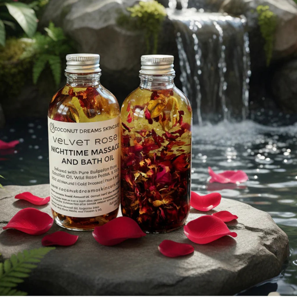 This Nighttime Massage and Bath Oil is especially made with Cold-pressed Sweet Almond Oil infused with pure Bulgarian Rose Essential Oil, Wild Rose Petals and Vitamin E. This lightweight formula deeply hydrates and nourishes the skin while you rest, promoting skin radiance. It is best for the after-shower face and body use or spa, enhancing your nighttime routine with beauty benefits and relaxation.